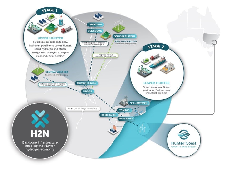 Energy Estate and Eurus Energy are developing the Hunter Hydrogen Network (H2N), backbone infrastructure and core projects drawing on the existing industrial ecosystem of the Hunter and delivering competitively priced hydrogen and derivative products through and from the Hunter Valley. It will be Australia’s first “hydrogen valley” and will involve large-scale electrolysers in the Upper Hunter and a 120km dedicated hydrogen pipeline through the Hunter Valley. It will be supported by large-scale renewable energy generation from the Renewable Energy Zones in NSW and will enable downstream production facilities for various derivative productions (e.g. Ammonia, e-fuels, methanol, liquid hydrogen etc), located in the lower Hunter Valley.