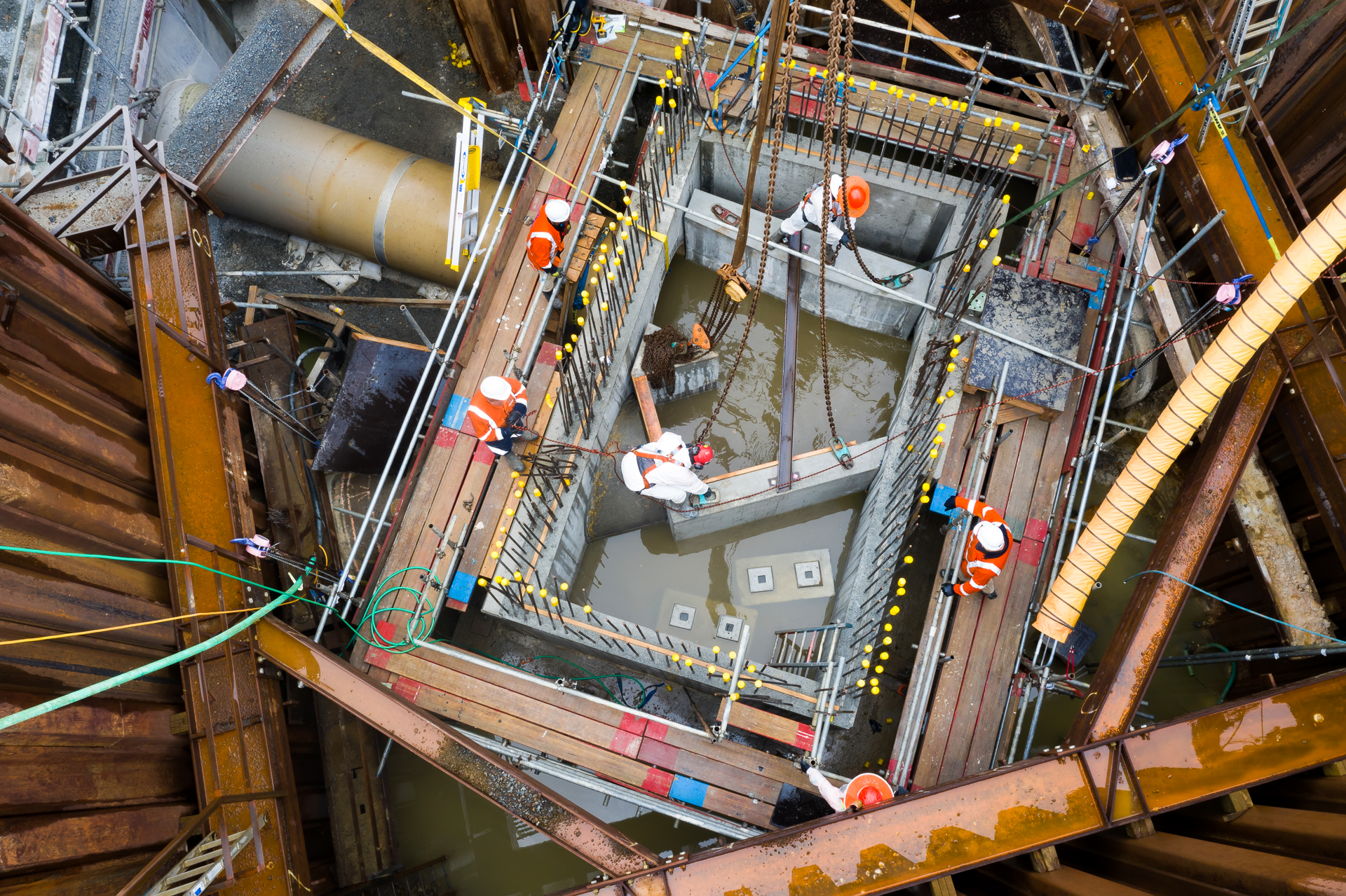 The three cut-in chambers had to be completed with live flows and no over-pumping. Due to the large flow volume in the trunk sewer, there was no room for error. Consequently, the construction team developed a special methodology to build the chambers around the pipe.