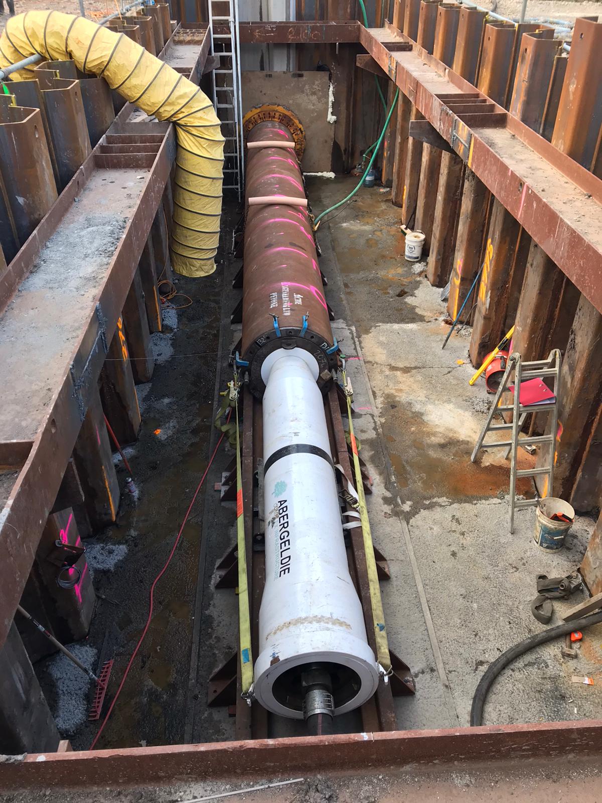 Working underneath KiwiRail assets, Abergeldie utilised the approved and preferred Pipe Ramming Method, which has very low opportunity for settlement. In this method, the Grundo Ram Taurus Hammer progresses forward while retaining the spoil entering the casing, creating substantial face pressure with the assistance of an inflated plug installed at the launch shaft. The Pipe Ramming Method is effective, even through poor soil.